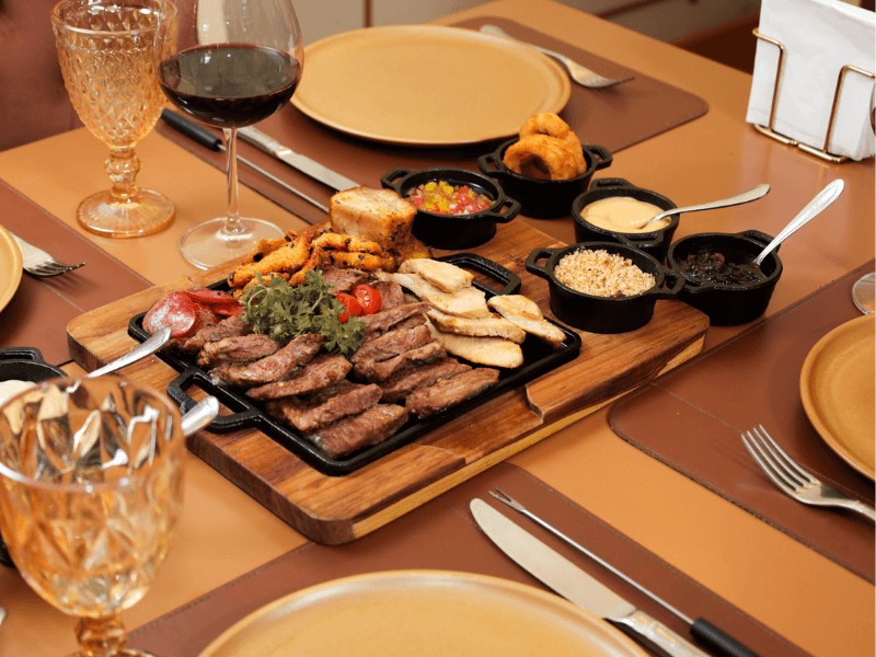 - Fondue de Carne: Na segunda etapa, são servidos cortes de carnes nobres, como filé mignon e entrecot, que serão servidas prontas na lâmina quente e acompanhados por caldos e molhos especiais criados exclusivamente pela Chocoland.